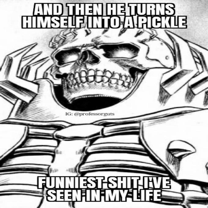 It might be a funny scene, movie quote, animation, meme or a mashup of multiple sources. Pickle rick meme cannot die because it's the funniest meme. Funniest thing after pickle rick.