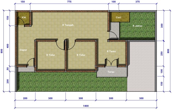 Denah rumah modern sederhana dan minimaliss 3 kamar.